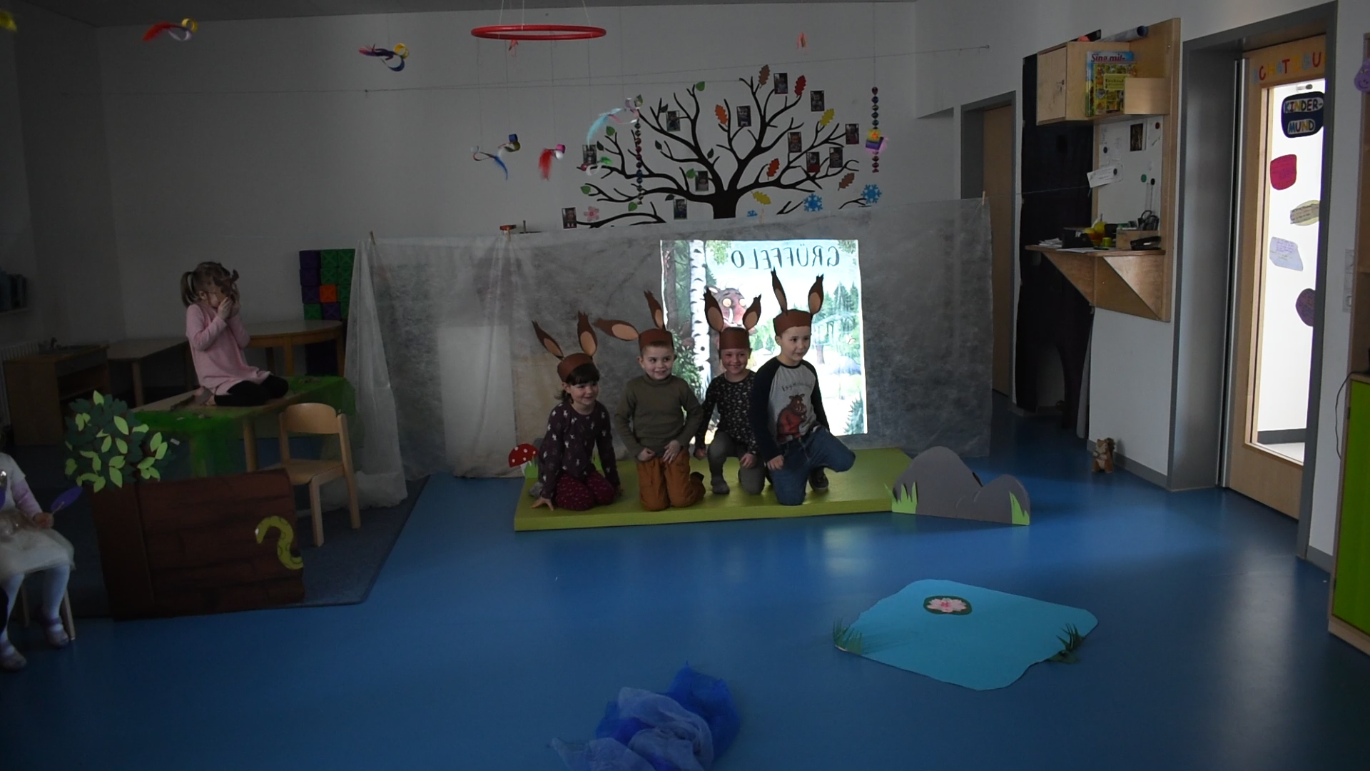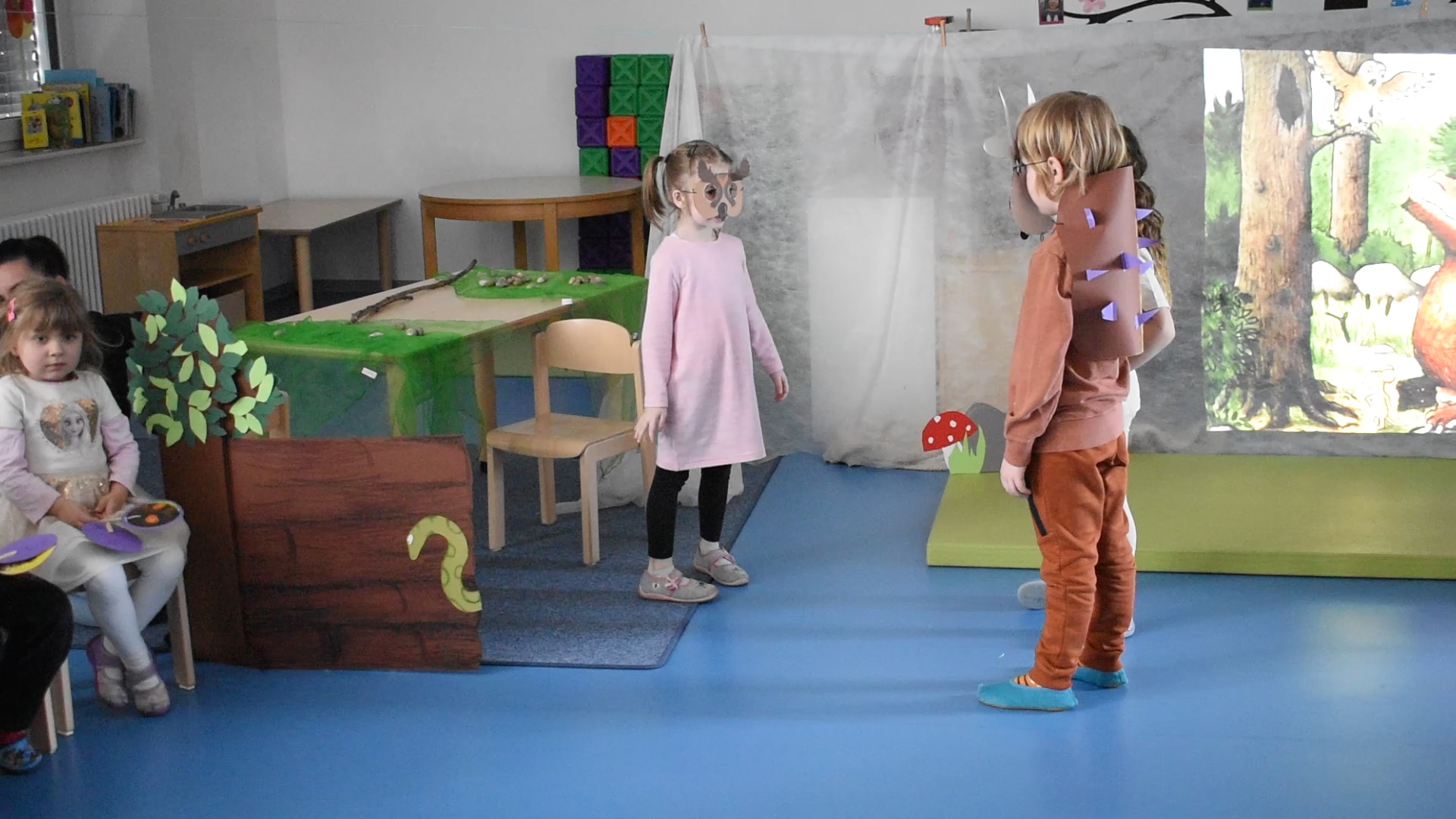 Das Projekt „Grüffelo“ endete mit einer „Grüffelo“-Theatervorführung am Eltern-Kind- Nachmittag. Für die Aufführung wurden fleißig Masken, Kulissen und Einladungskarten gebastelt, es wurde wochenlang eifrig geprobt. So fieberten alle Kinder dem großen Tag entgegen, an dem sie ihren Eltern ihr schauspielerisches Talent zeigen konnten. Die große Vorführung meisterten unsere Schatzsucher mit Bravour.