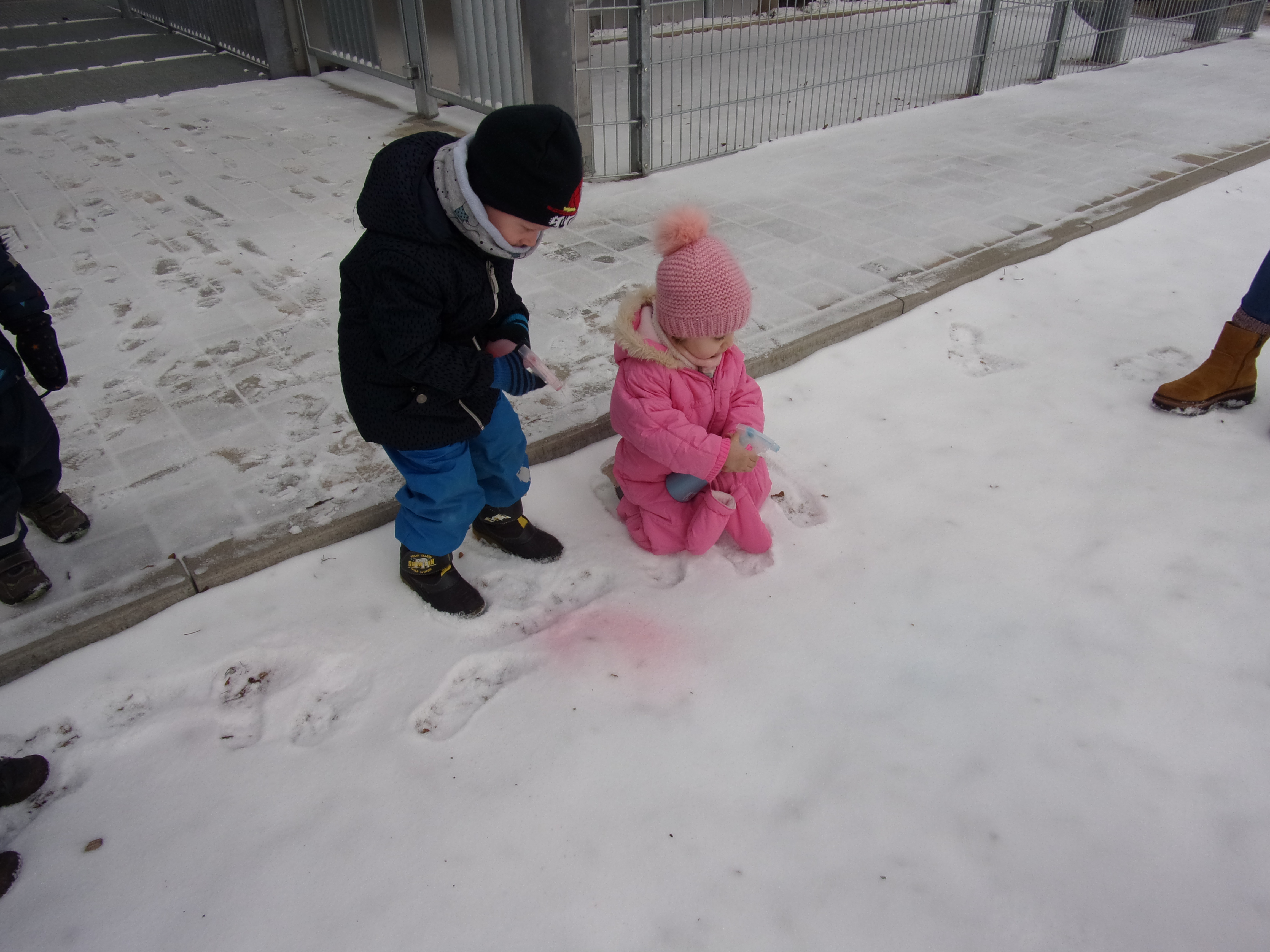 Danach haben wir Sprühflaschen mit Wasser und Fingerfarbe gefüllt und haben dieses Wasser auf den Schnee gesprüht. So war es möglich, den Schnee zu färben und im Schnee zu malen.