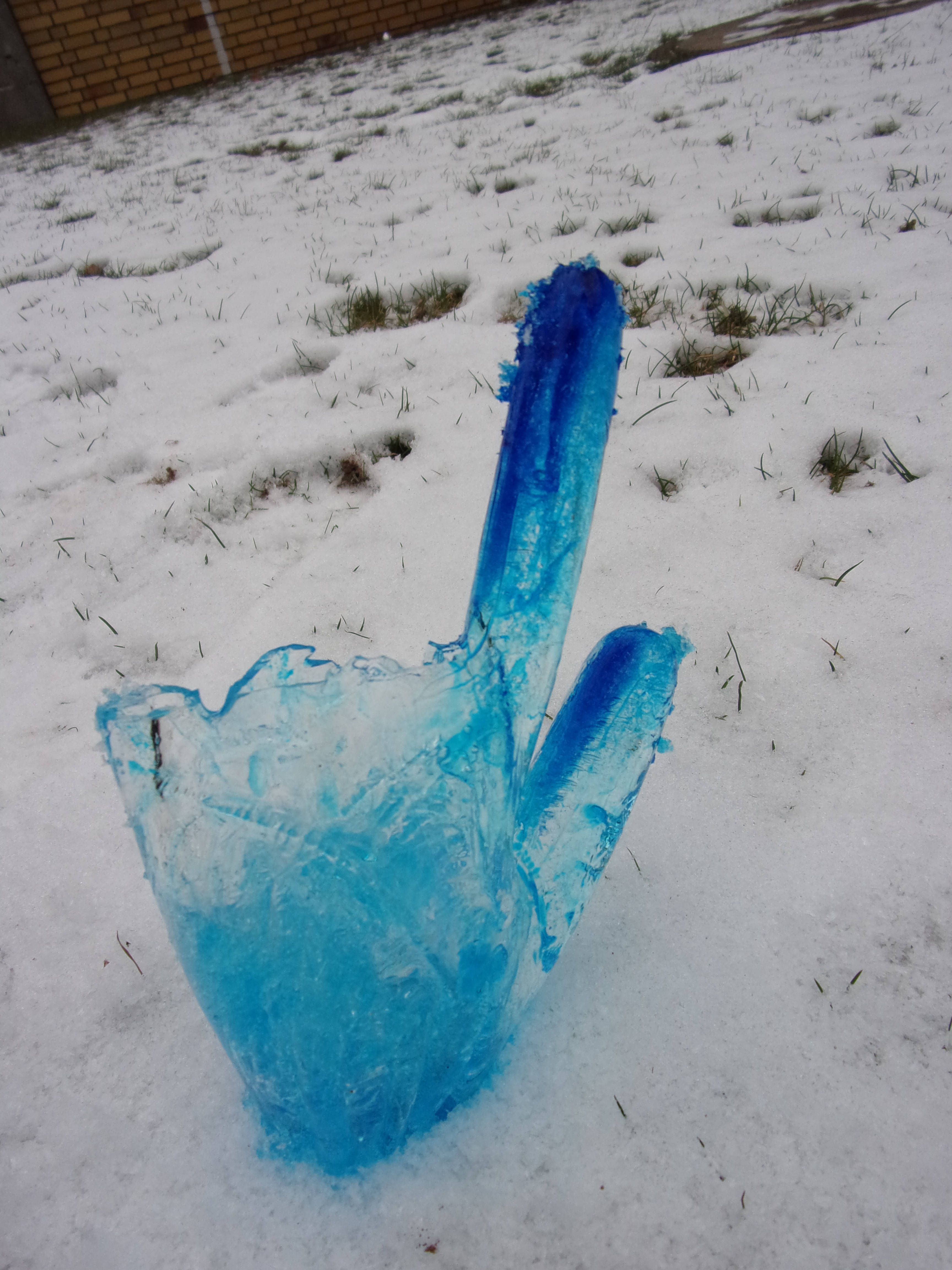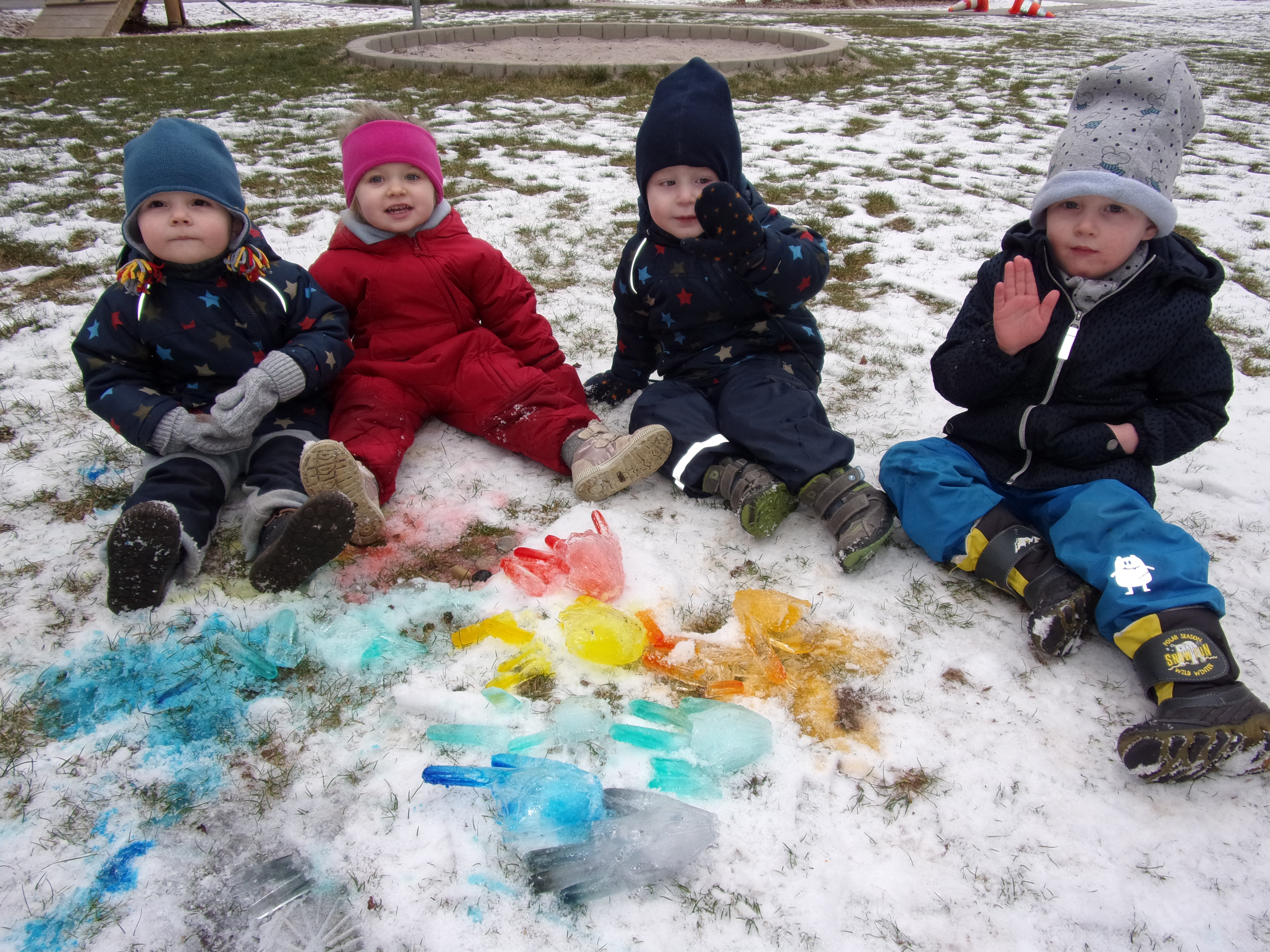 Als Projektabschluss wurden Einmalhandschuhe mit Wasser und Lebensmittelfarbe gefüllt und diese übers Wochenende ans Außengeländer gehängt. Nach dem Wochenende haben wir die Handschuhe aufgeschnitten und die gefrorenen „Eishände“ in den Schnee gelegt.