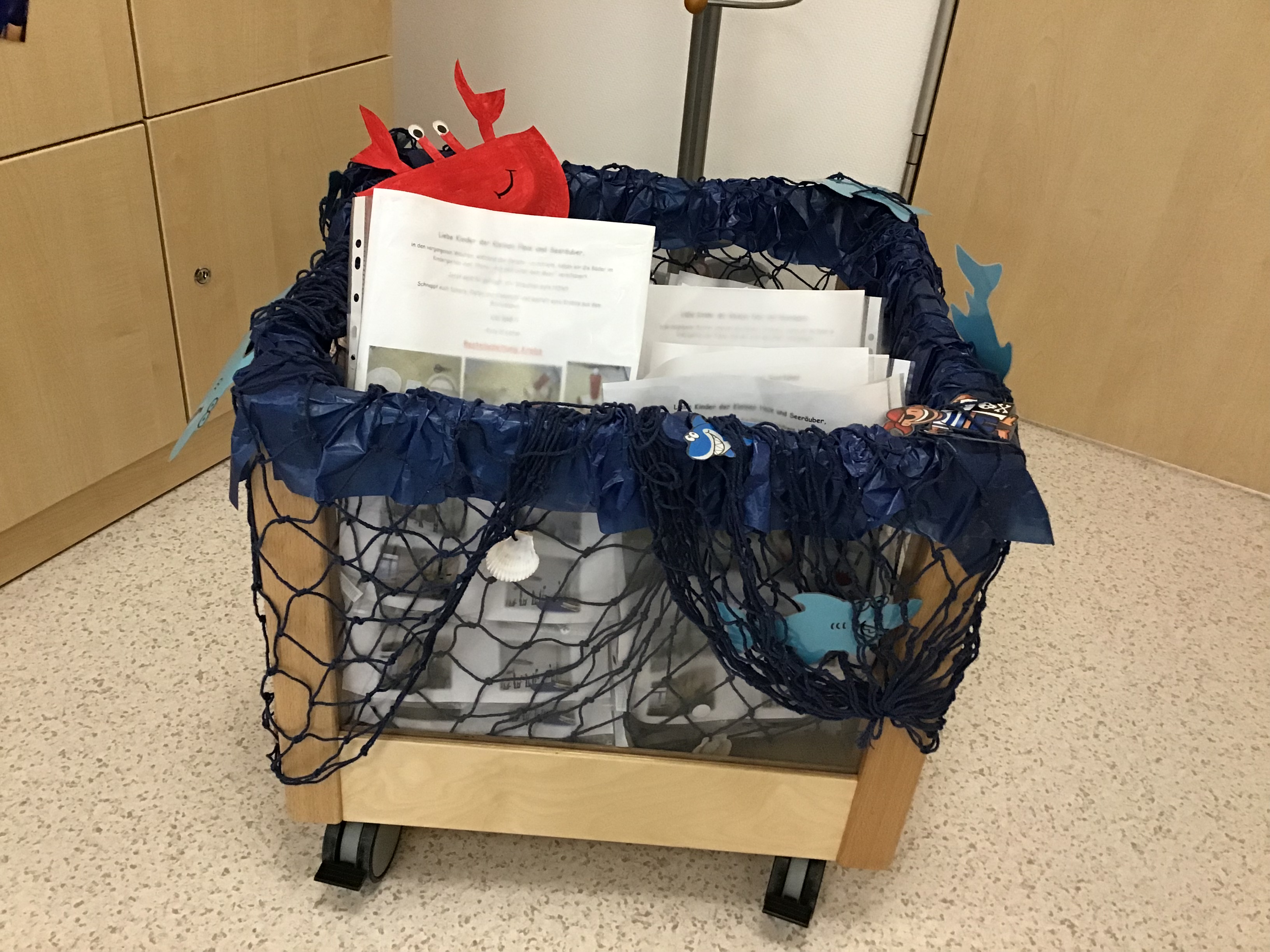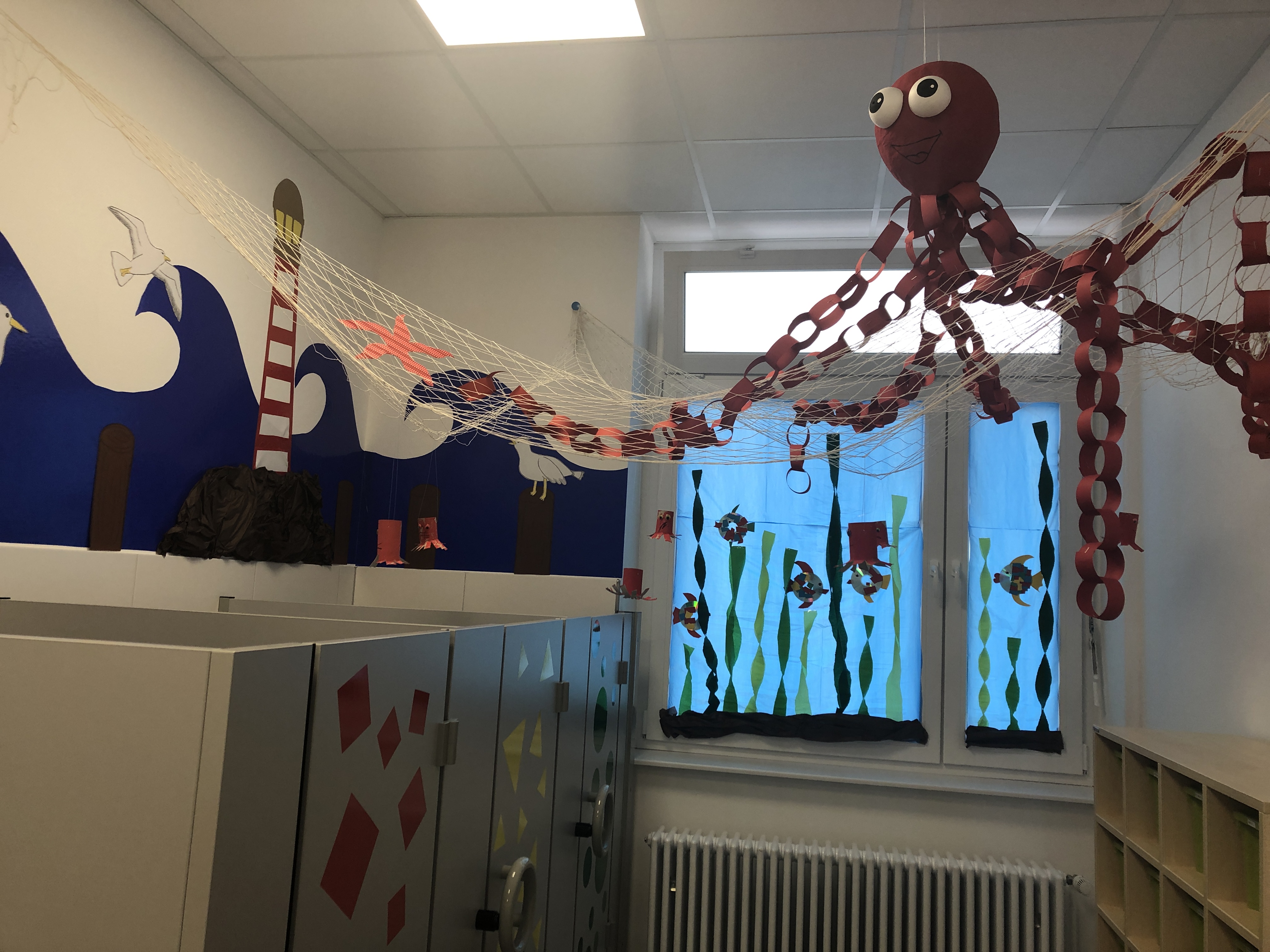 Nachdem zwischenzeitlich die Fenster mit Wasser und die Wände mit gebastelten Fischen und Algen dekoriert waren, ging es mit einem Leuchtturm, mit Möwen, Kraken und Krebsen weiter. Natürlich duften auch große Fischernetze nicht fehlen.