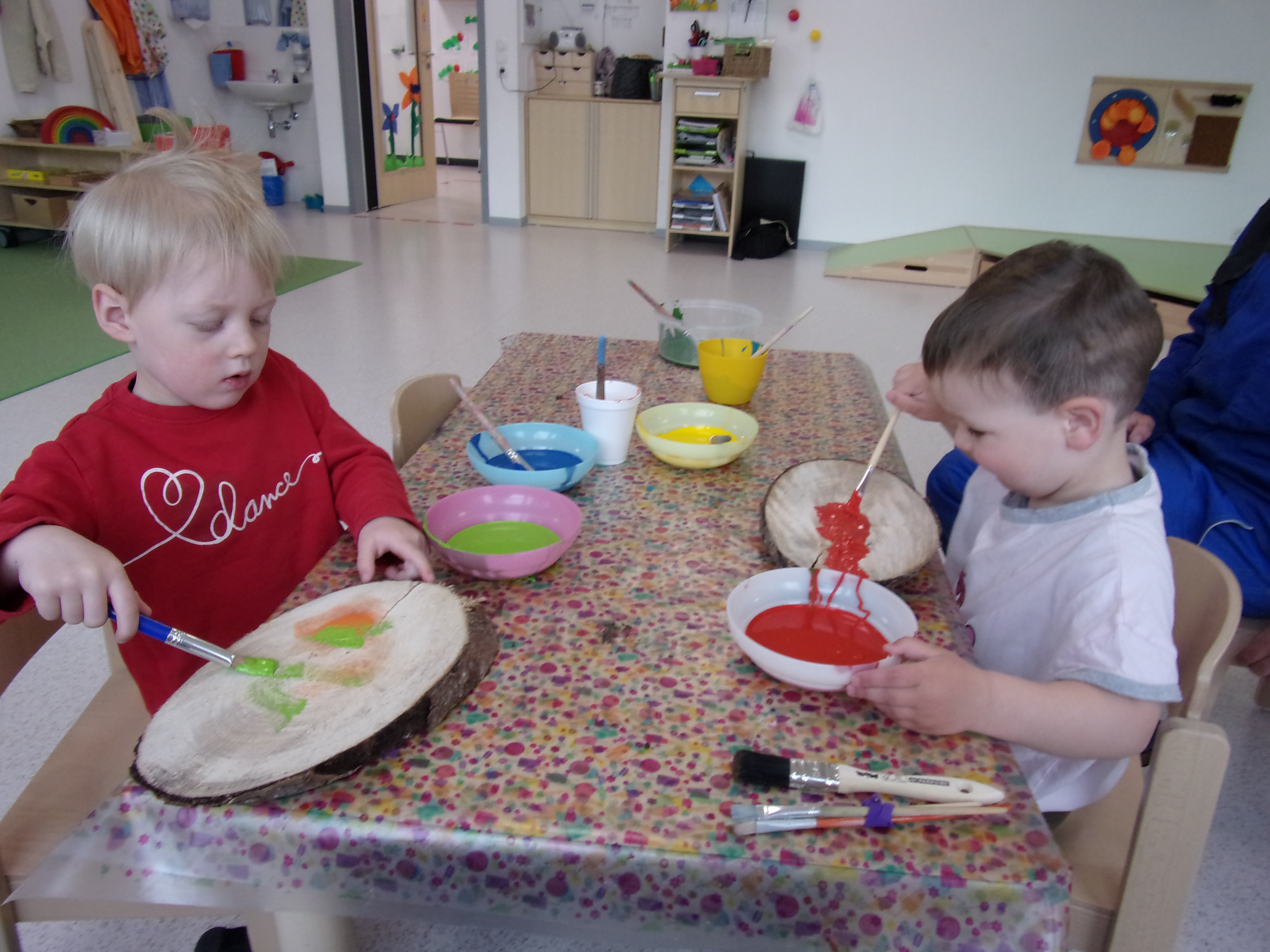 Dabei entstanden viele kreative und bunte Baumscheiben und Holzzaunlatten, die nun unser Außengelände verschönern.