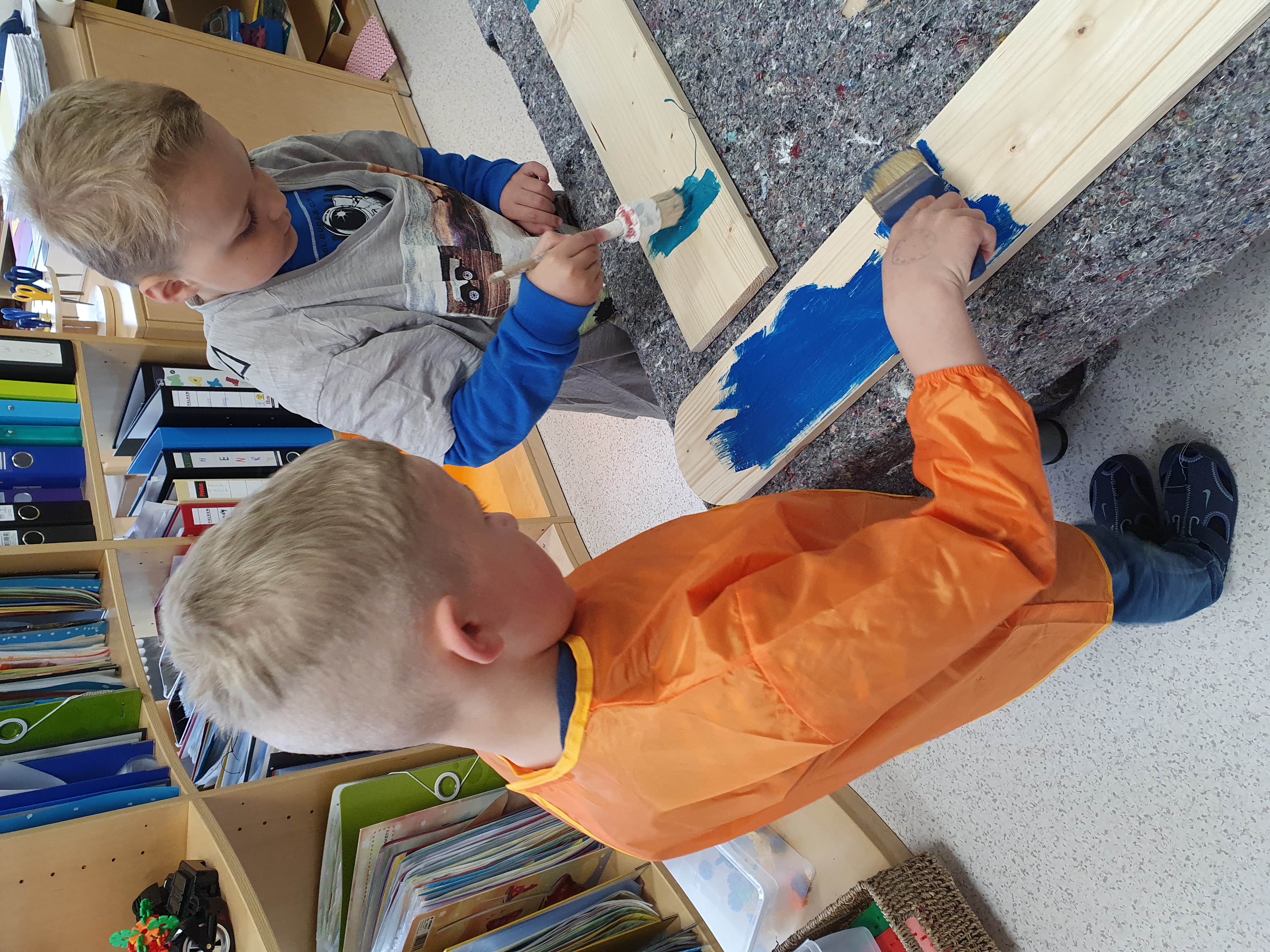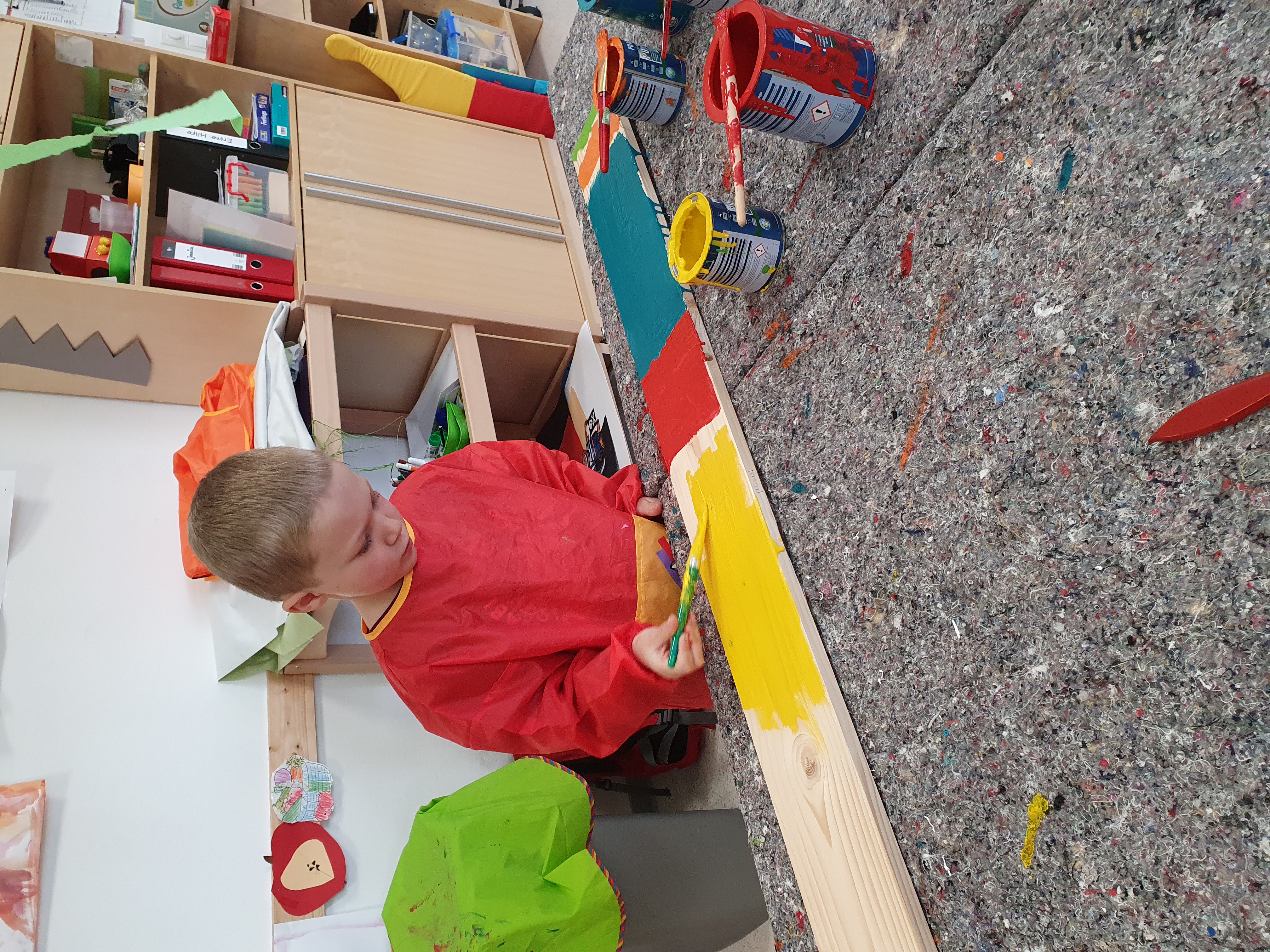 Viele große und kleine Handwerker der Schatzinsel krempelten ihre Ärmel hoch und schritten selbst zur Tat. Mit Schleifpapier, Malkittel und Pinsel ausgerüstet, wurden fleißig Baumscheiben abgeschliffen und anschließend, genau wie Holzzaunlatten, ganz individuell von den Kindern lackiert und gestaltet.