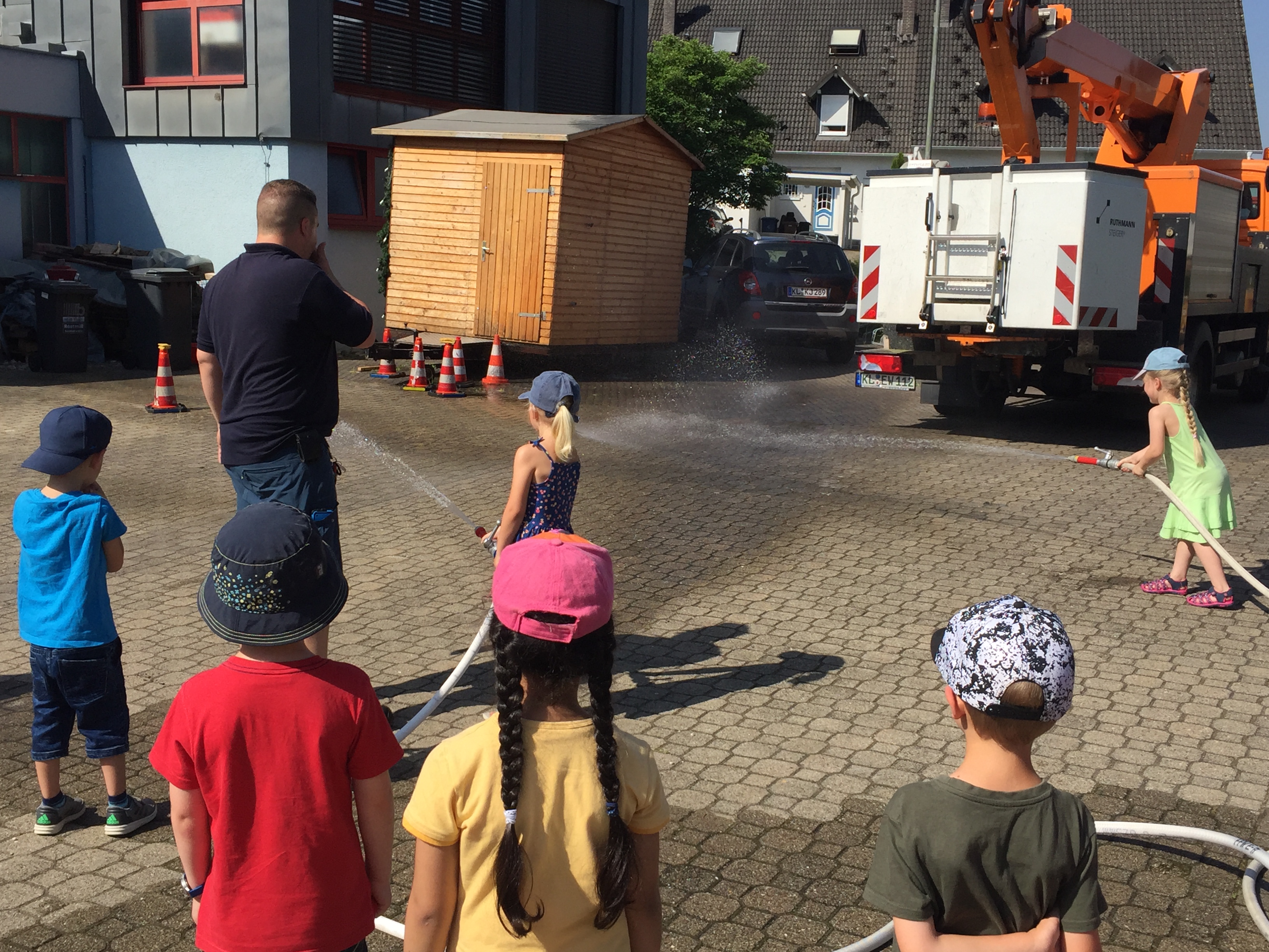 Endlich ging es raus und die kleinen Seeräuber durften sich die Fahrzeuge ansehen und bestaunen. Sie durften sogar in einem Hilfeleistungslöschfahrzeug Platz nehmen und die darin befindlichen Gerätschaften bestaunen. Da es an diesem Tag so heiß war, durften die Kinder mit Hilfe von Herrn Keller eine Wasserversorgung im Hof aufbauen und sich danach beim „Löschen“ etwas abkühlen. Letztendlich ging es hoch hinaus für die Kleinen. Jedes Kind, das mochte, durfte mit der Drehleiter in die Lüfte steigen. Unsere Kinder waren überaus begeistert und werden dieses Erlebnis so schnell nicht vergessen. Vielen herzlichen Dank an Johannes Keller und Norbert Wiemer; ihr habt diesen Vormittag für uns unvergesslich gemacht.