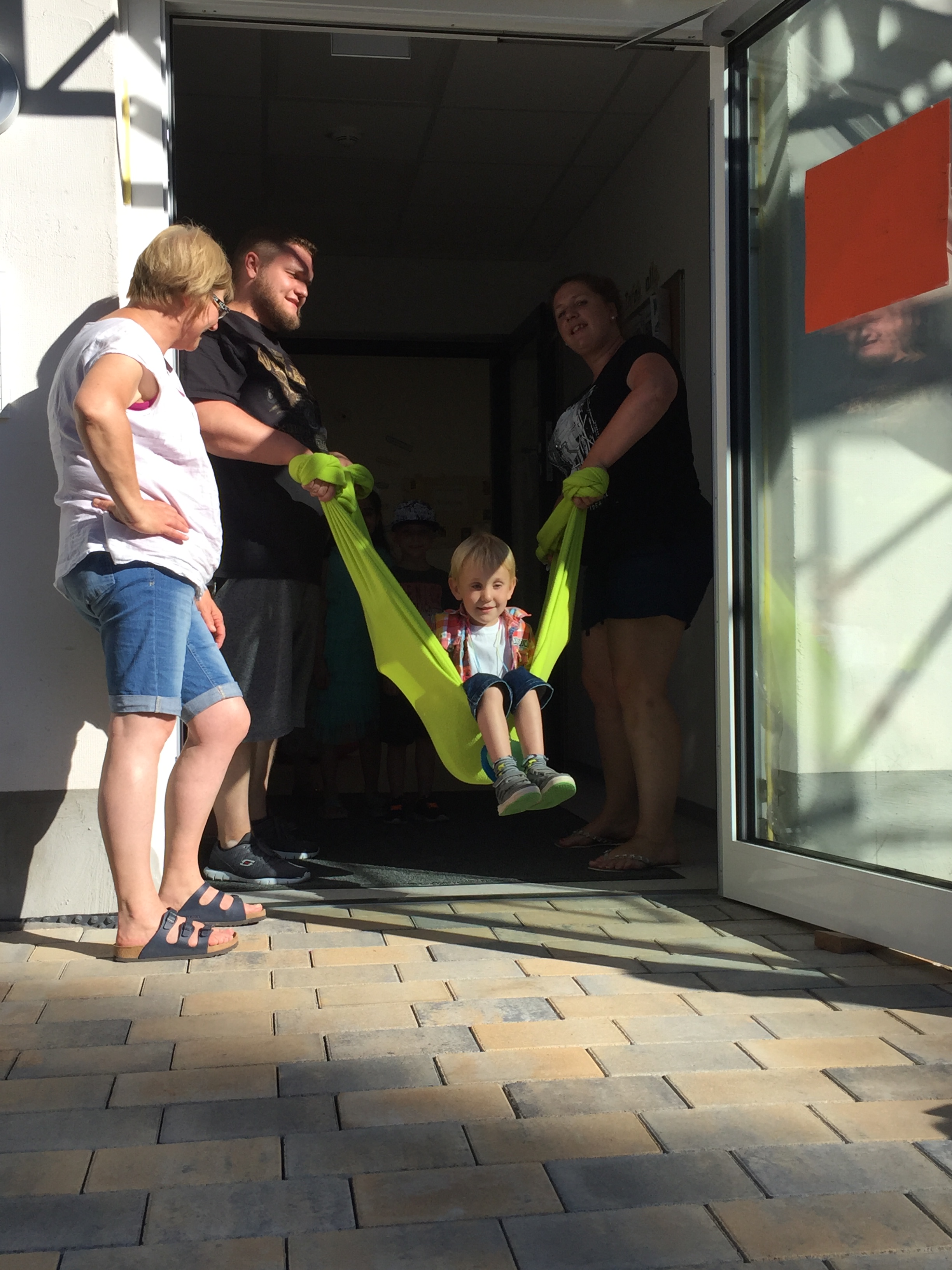 Die kommissarische Kita-Leitung Frau Günther hielt noch eine kleine Rede, bevor es dann zum emotionalsten Moment des Abends kam. Die Kinder wurden von ihrem Erzieher Yannic Schaak und ihrer Erzieherin Jessica Wolf auf einer Decke aus der Eingangstür der Kita geschaukelt und letztendlich „rausgeworfen“. Frau Günther, sowie die Erzieher untermalten diesen Moment bei jedem Kind mit einem Lied.